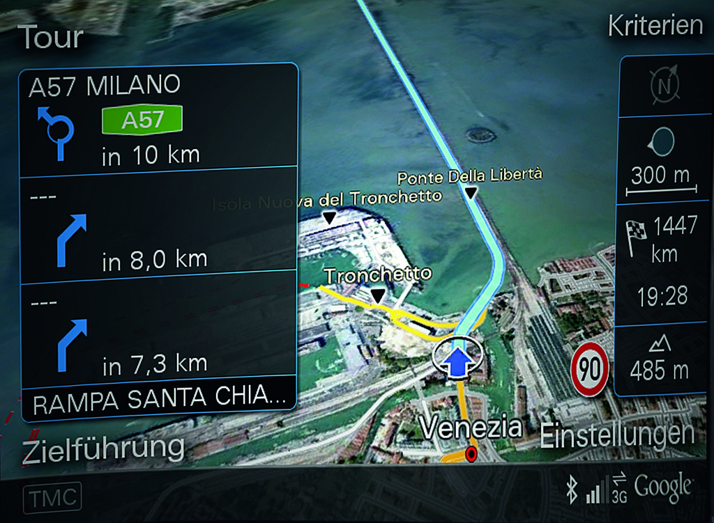 محصول جدید آئودی به نام A3 مجهز به یک ماژول برقراری ارتباط نسل چهارم (LTE) و مداری جدید است که به تمام محصولات دیجیتال سرنشینان متصل می شود. با این سیستم به جای استفاده از یک پایگاه داده منسوخ، خودرو دائما به اینترنت متصل است و داده های مورد نیاز خود را برای مسیریابی از گوگل دریافت می کند. به این ترتیب غیر از پیدا کردن راه، می توان برای هر چیزی در اینترنت جستجو کرد. علاوه بر این به کمک گوگل، آئودی توانسته سیستمی جدید تحت عنوان POI را راه اندازی کند. برای مثال اگر هر کدام از سرنشینان درون خودرو عبارتی همچون «کیک خامه ای» را به زبان آورند، خودرو فورا از سوی گوگل نزدیک ترین قنادی ها را به سرنشینان معرفی می کند. طبیعتا اگر راننده گرسنه هم باشد، تنها با بیان گرسنه ام می تواند از خودروی خود نزدیک ترین غذاخوری را در جایی که هیچ آشنایی از آن محل ندارد، بیابد.