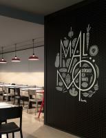 می توانید از نام تجاری خود به فضا کمک کنید. سعی کنید یک دیوار خاص با نام رستوران خود ایجاد کنید ، مانند این تایپوگرافی نقاشی در رستوران Malmö در والنسیا، اسپانیا، که دارای نام تجاری همراه با چند ماده اصلی مانند بادمجان، قارچ و آجیل است، ایجاد کنید.